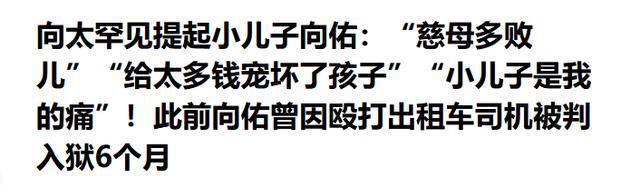向太没办法,只好继续满足向佑,向佑创业多次失败,在错误的道路上越走越远,曾嚣张到在大街上当众殴打出租车司机。 向太无奈自曝,向佑因为打人直接被抓进去坐个月,儿子真的被她宠坏了,现在回想真的很后悔。 惯子如杀子,向太赚这么多钱,到头来孩子不争气,又有什么办法。